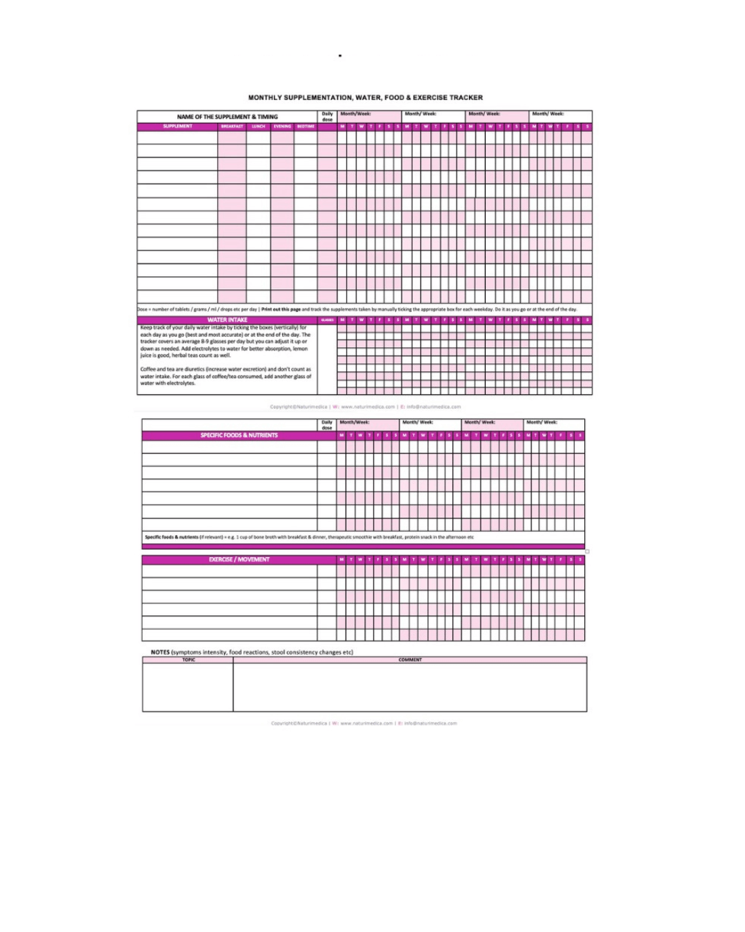 Tailored monthly health tracker template: supplements, water intake, food and exercise/ movement + notes.